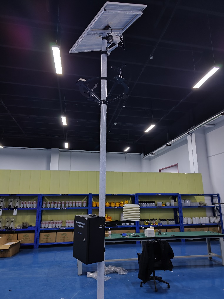 20、设备安装完成(注:电池线从灯杆底部穿入控制箱;叶面温湿度传感器线从控制箱底部穿入控制箱,传感器固定于树枝枝干上)